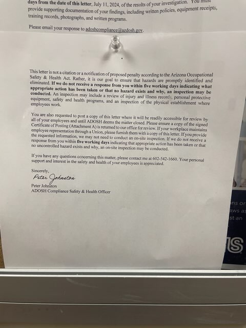 Quail had also been investigated in June, before the second riot, after an employee complained to The Arizona Department of Health Services (OSHA for the state of Arizona), who stated: